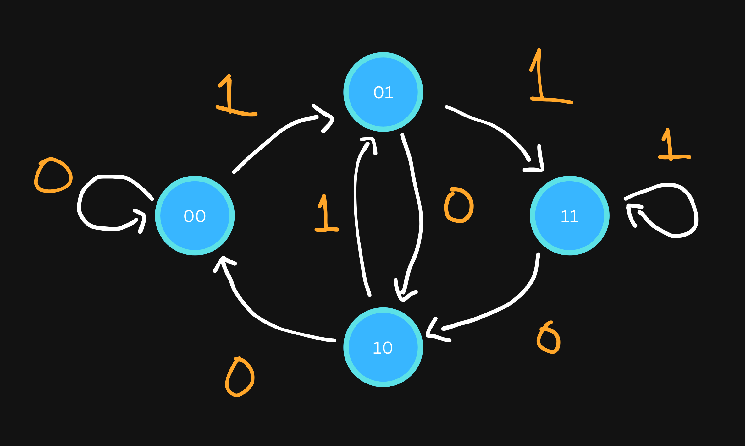 We can visualize the transitions - adding or - using an oriented graph whose nodes contain a string of length .